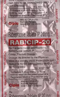 What is Rabicip 20 Tablet (Rabeprazole 20mg) used for? Rabicip 20 Tablet (Rabeprazole 20mg) is a proton pump inhibitor used to treat acid-related conditions like gastroesophageal reflux disease (GERD), peptic ulcer disease, and Zollinger-Ellison syndrome. It works by lowering the amount of acid your stomach produces, providing relief from symptoms, and promoting healing.